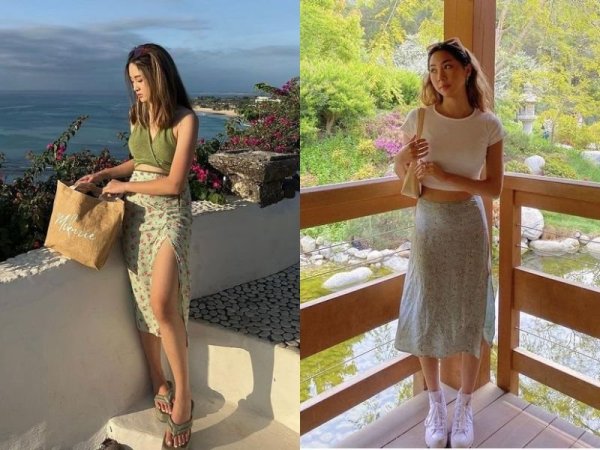 Chân váy hoa xẻ tà giúp khoe chân thon (Nguồn: Kit & kay lee/Pinterest) MUA NGAYPhối đồ cho người gầy nữ với quần yếm