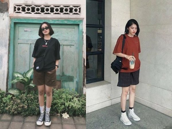 Bạn có thể chọn dáng quần short dài gần đến đầu gối, kết hợp với áo thun có kích cỡ thoải mái. Cách phối này sẽ giúp chia chân làm nhiều phần, từ đó khắc phục hình ảnh đôi chân bị dài và khẳng khiu thường thấy của các cô nàng mảnh khảnh. Thêm điểm nhấn với túi xách đeo chéo hoặc kính mát thì bạn sẽ trông sành điệu hơn.