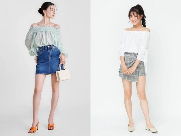 Áo trễ vai sẽ giúp set đồ trông nữ tính hơn (Nguồn: Gumac và Wattpad) MUA NGAYCách phối đồ cho người lùn bắp chân to nữ với chân váy xòe