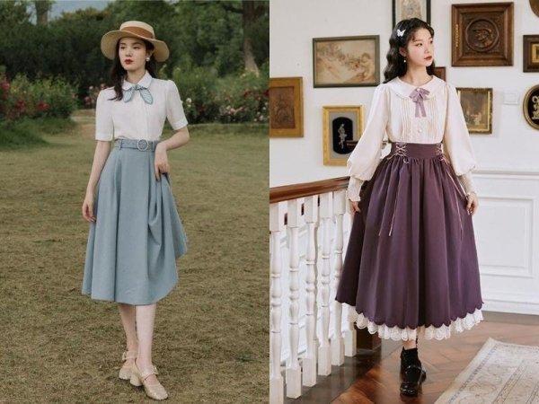 Chân váy midi vintage sẽ giúp bạn trông thật đẹp và sang trọng (Nguồn: yesstyle.com & lolitawardrobe.com) MUA NGAYPhối đồ công sở cho nấm lùn