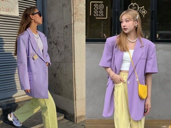 Một trong những cách phối đồ khá lạ và độc đáo là kết hợp màu vàng nhạt cùng màu tím. Với phong cách sáng tạo này, hãy sử dụng một chiếc áo blazer màu tím dáng rộng kết hợp cùng một chiếc quần vàng nhạt cho tổng thể thật năng động, đáng yêu.