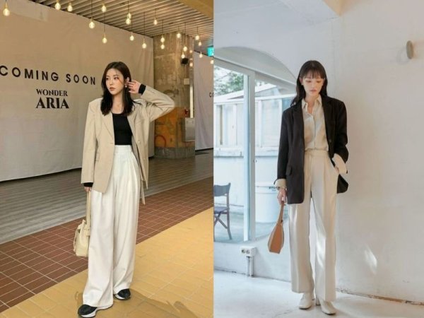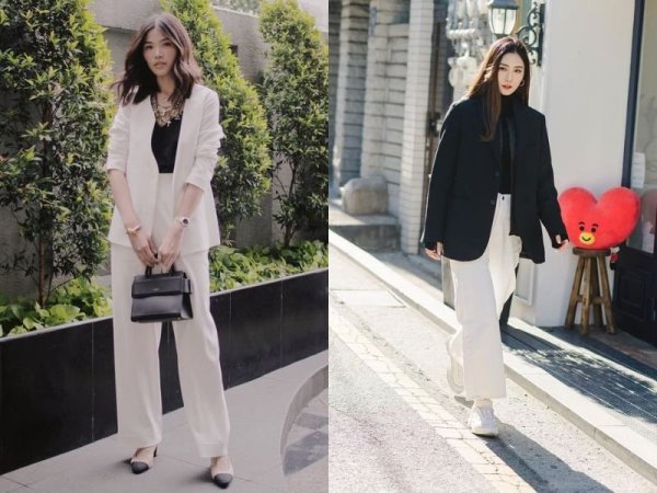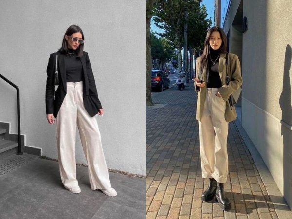 Diện quần tây trắng phong cách (Nguồn: Anna Pham, Boohoo – Pinterest)Quần suông trắng phối với áo blazer