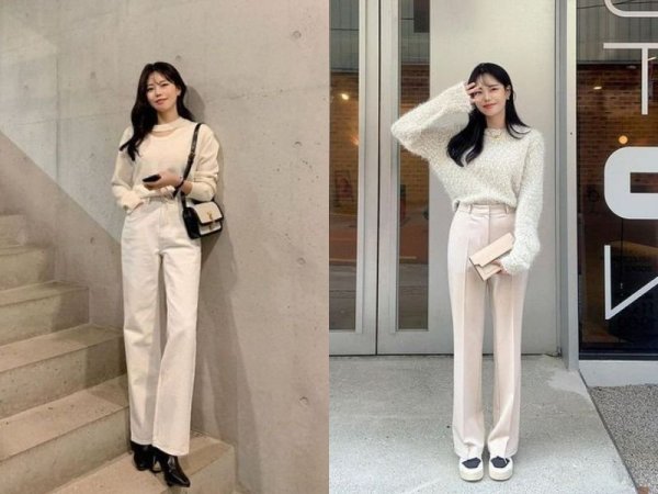 Đa dạng gu thời trang mùa đông với quần suông trắng (Nguồn: Korean, naava – Pinterest)Quần suông trắng mix cùng áo croptop tay dài