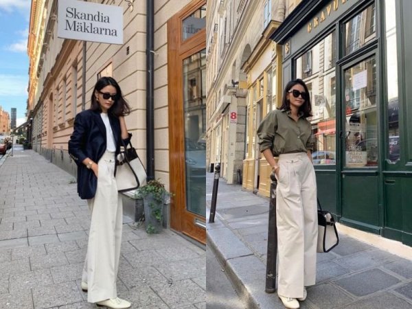 Mix quần ống rộng trắng nổi bật (Nguồn: Alice, Luiza Brechane – Pinterest)Phối đồ cùng short trắng và áo sơ mi
