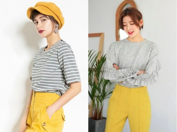 Bộ đôi xám và vàng sẽ đem đến một vẻ ngoài năng động nhưng vẫn không kém phần thanh lịch cho các quý cô. Đây cũng là cách phối màu được nhiều người làm nghệ thuật lựa chọn. Bạn có thể chọn một áo thun xám nhạt và kết hợp nó với một quần jogger hoặc quần ống rộng màu vàng để tạo nên một trang phục ấn tượng và thú vị. Bạn cũng có thể phối thêm một số phụ kiện màu vàng như túi xách, nón hoặc khăn quàng cổ để tạo thêm điểm nhấn cho outfit.