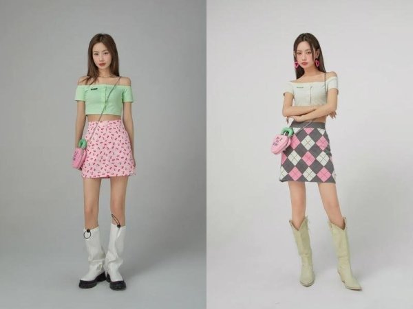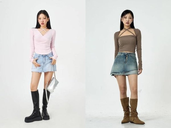 Các mẫu chân váy chữ A ngắn màu trung tính sẽ phù hợp với set đồ này (Nguồn: en.chuu.co.kr)Mix chân váy chữ A với áo trễ vai