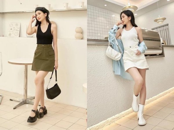 Nếu bạn là người theo đuổi phong cách thời trang năng động, cá tính, thì có thể chọn phối chân váy chữ A cùng áo tank top. Với cách mix đồ này, bạn có thể chọn một chiếc váy chữ A cạp cao hoặc dáng xòe để set đồ trông nổi bật và che được khuyết điểm “chân ngắn” khi đi chơi cùng bạn bè. Ngoài ra, để hack dáng tốt hơn, bạn có thể chọn một đôi giày thể thao hoặc giày dép có đế cao rồi kết hợp cùng set đồ này.