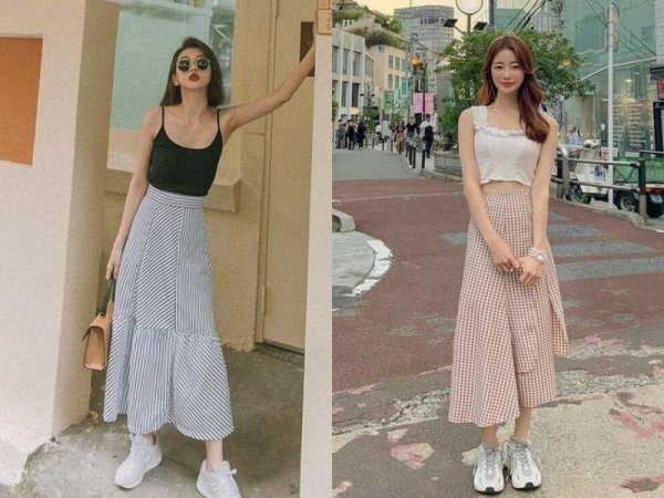Diện cùng đôi giày sneaker sẽ giúp bạn năng động hơn (Nguồn: Phí Thị Thanh Thuỷ và Mint.Tang/pinterest.com) Mua Ngay> Xem thêm: Phối đồ với chân váy dài cùng top 21+ outfit xinh đúng điệu