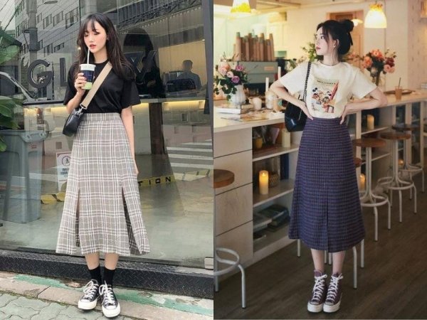 Áo thun kết hợp cùng chân váy chữ A dáng dài là một phong cách “basic” phù hợp cho những cô nàng yêu thích đơn giản và năng động. Cách phối đồ này phù hợp với những bạn học sinh, sinh viên bởi tính chất thoải mái và lịch sự.