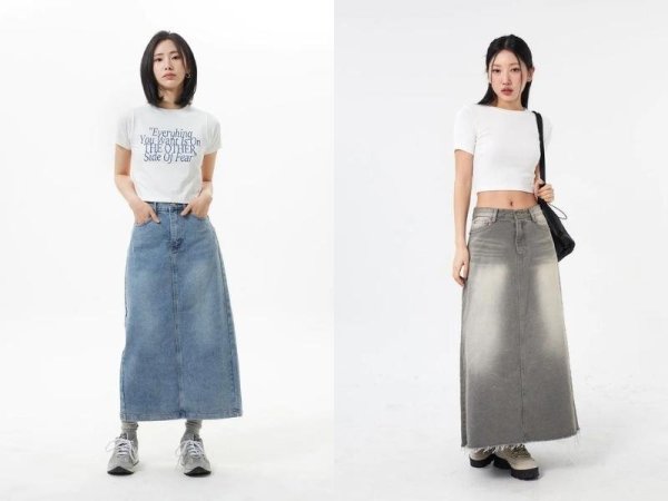 Chân váy chữ A jeans dáng dài cũng được nhiều bạn nữ ưa chuộng (Nguồn: lewkin.com) Mua NgayPhối đồ với chân váy chữ A và áo blazer