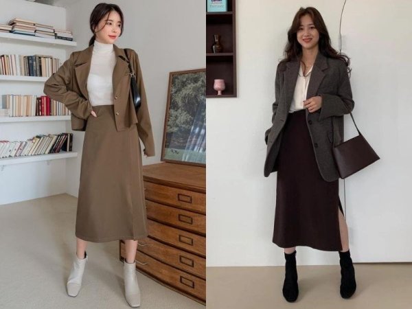 Các mẫu chân váy chữ A dáng dài màu sáng luôn phù hợp để phối cùng các kiểu áo khác nhau (Nguồn: Mint.Tang và chicme) Mua NgayPhối đồ với chân váy chữ A mùa đông và áo sweater