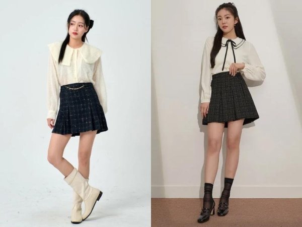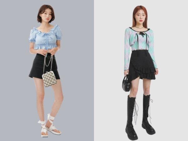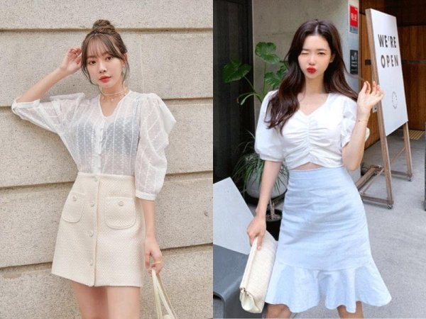 Áo tay phồng giúp bạn có outfit nữ tính hơn (Nguồn: m.shein.com và m.en.chuu.co.kr) Mua Ngay Set đồ nữ tính với chân váy chữ A ngắn (Nguồn: phunuonline.com.vn và beecost)Phối chân váy chữ A ngắn và áo len