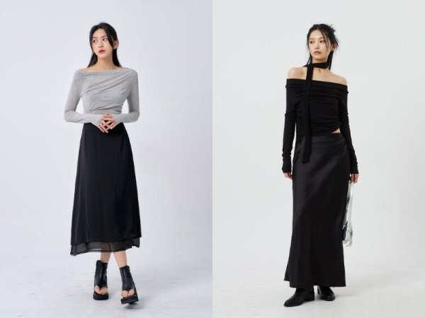Cách phối đồ với chân váy đen xòe dài và áo trễ vai