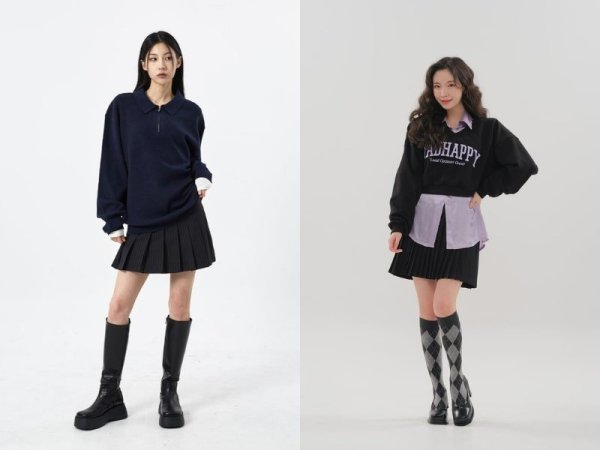- Phong cách độc đáo và trẻ trung với chân váy xếp ly dài và áo len