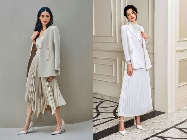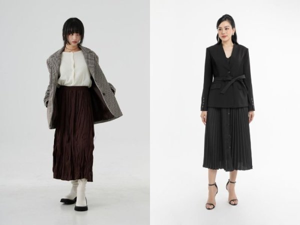 Áo khoác blazer mang đến vẻ lịch thiệp và chuyên nghiệp cho bất kỳ trang phục nào. Khi phối chân váy xếp ly dài, bạn hãy chọn áo khoác blazer có form rộng rãi để che đi vùng bụng và hông. Áo khoác blazer phù hợp với môi trường làm việc công sở hoặc các sự kiện đặc biệt với vẻ ngoài sang trọng và thời thượng.