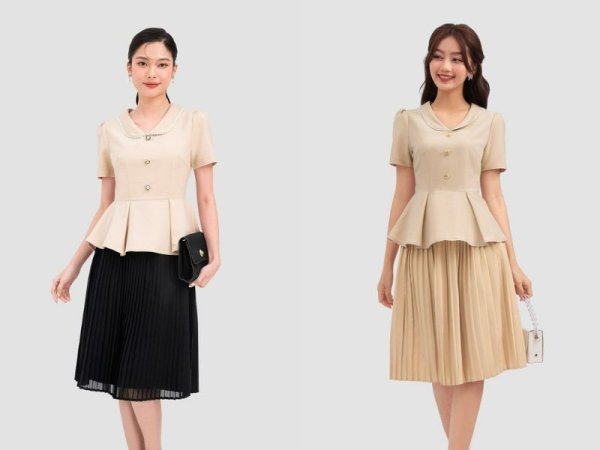 Áo peplum giúp các bạn nữ trông sang trọng và quý phái hơn (Nguồn: GUMAC) Mua NgaySang trọng khi mix chân váy xếp ly dài và áo trễ vai