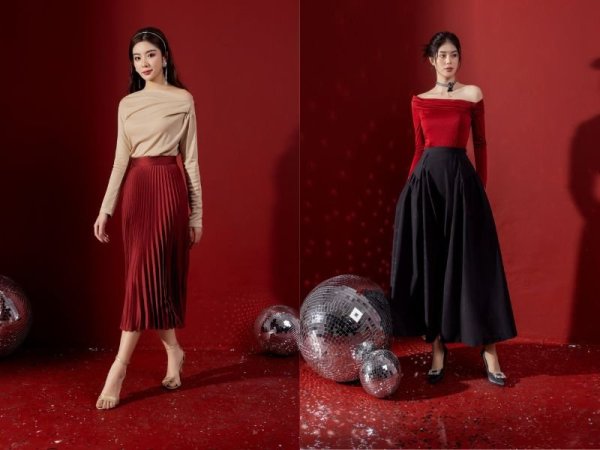 Hack chiều cao và sang trọng hơn khi phối đồ với áo trễ vai (Nguồn: IVY Moda) Mua Ngay5+ cách phối đồ với chân váy xếp ly dài cho nàng mũm mĩm