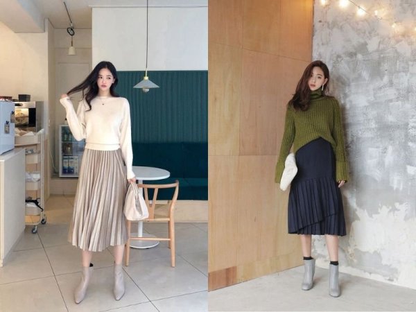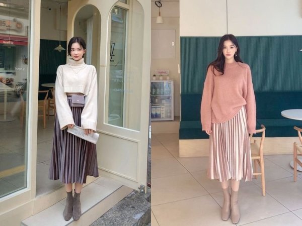 Thanh lịch và ấm áp cho mùa đông với áo len (Nguồn: Mint Tang) Mua NgayPhối đồ với chân váy xếp ly dài và áo tay dài giúp che khuyết điểm tốt