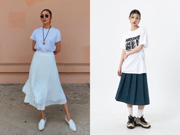 Đối với một phong cách casual và thoải mái thì sự kết hợp giữa chân váy xếp ly dài với áo thun là lựa chọn tuyệt vời. Khi phối đồ với hai item này, bạn chỉ cần lưu ý lựa chọn màu sắc cho phù hợp là đã có ngay set đồ đơn giản nhưng vẫn không kém phần năng động cho ngày hè nắng nóng, đi học hoặc đi làm. Bạn có thể chọn áo thun in họa tiết hoặc áo thun trơn để tạo thêm điểm nhấn.