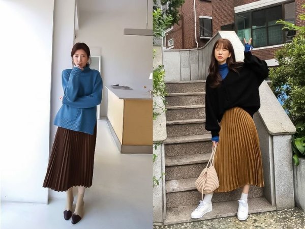 Một phong cách thanh lịch và vintage với sự kết hợp giữa chân váy xếp ly dài và áo len cổ lọ. Với cách phối đồ này, bạn nên lựa chọn các tông màu trung tính cho áo len cổ lọ như xám, nâu hoặc be kết hợp với chân váy nhung xếp ly dài tạo nên một phong cách vintage cho ngày đông. Bạn có thể kết hợp thêm áo khoác dạ hoặc denim cùng tông màu để tạo thêm điểm nhấn cho bộ trang phục.