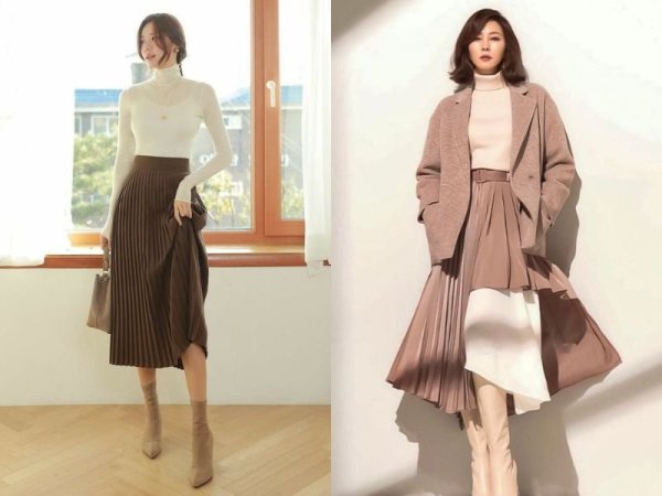 Để có một vẻ ngoài ấm áp nhưng vẫn không kém phần điệu đà thì cách phối đồ này là sự lựa chọn hoàn hảo dành cho bạn. Chân váy xếp ly dài thường phủ qua đầu gối nên vẫn đảm bảo cho bạn một outfit ấm áp cho ngày đông, bên trong bạn có thể mặc áo sơ mi, áo len cổ cao hoặc áo thun và khoác thêm áo khoác dạ là đã có ngay outfit ấm áp. Bạn có thể lựa chọn áo dạ có màu trung tính hoặc màu pastel để tạo sự thanh lịch và phù hợp với mùa đông nhé!