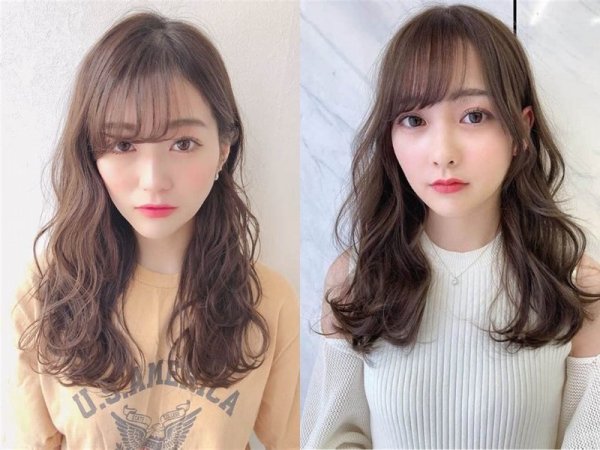 Tóc mì tôm với mái dài (Nguồn: hotpepper.jp) Tóc mì tôm với mái dài (Nguồn: glamourmaguk, Miyahhhhachi – Pinterest)Tóc mì tôm với mái bằng