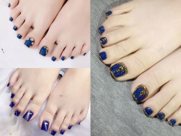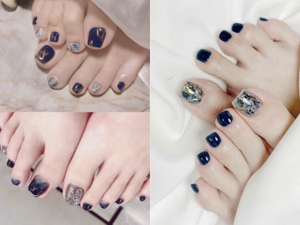Màu sơn móng chân đẹp trắng da xanh đen trầm phù hợp với các nàng có làn da ngăm, đen (Nguồn: Như Ý Nguyễn – Pinterest, Ann Nhi – Pinterest, MiMijChan – Pinterest) Sơn móng chân màu xanh đen kết hợp đính đá sẽ giúp nàng thêm nổi bật với phong cách sang trọng, quý phái (Nguồn: Như ý Nguyễn – Pinterest, Ann Nhi – Pinterest, Quyen Dieu Nguyen – Pinterest)Màu sơn móng chân xanh sapphire làm trắng da