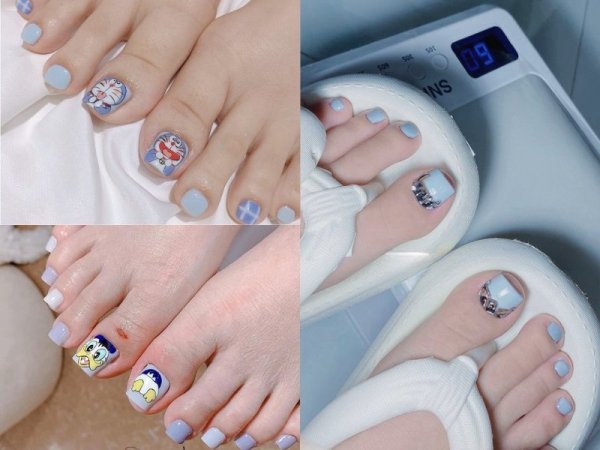 Sơn móng chân màu xanh pastel nhẹ nhàng, tự nhiên, phù hợp cho cả các bạn học sinh, sinh viên (Nguồn: Sora – Pinterest, Anna Nail – Pinterest, moonnnnn1712 – Pinterest) Kiểu vẽ hình đáng yêu sẽ giúp bạn thêm trẻ trung còn kiểu đính đá sẽ giúp phong cách của bạn thêm thanh lịch, nữ tính (Nguồn: Jade Phan Nailart – Pinterest, Caycarem – Pinterest, Huế Trân – Pinterest)Mẫu nail chân màu nude trắng da
