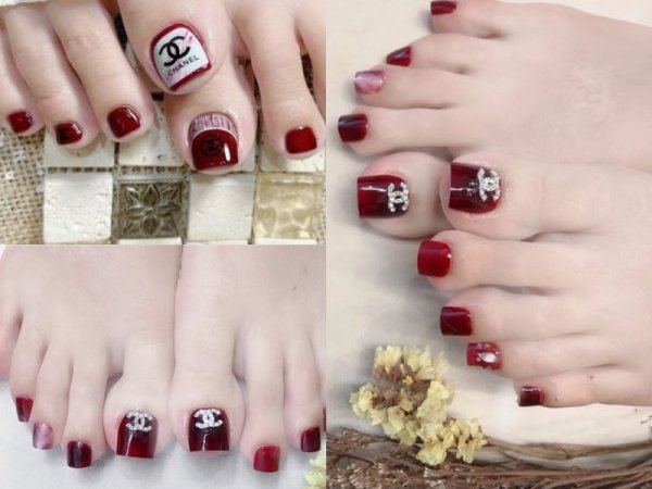 Màu đỏ rượu là một trong những màu sơn móng chân sang trọng và quyến rũ nhất. Đặc biệt sắc đỏ rượu trầm còn giúp da trắng sáng, tạo vẻ đẹp huyền bí, quý phái. Bạn có thể kết hợp thêm một lớp sơn gel bóng lên bề mặt để phần nail chân trông lấp lánh hơn. Màu sơn móng này dễ dàng phối hợp với bất kỳ trang phục nào, đặc biệt là các kiểu trang phục quyến rũ, nữ tính. Sơn móng đỏ rượu kết hợp thêm các hình vẽ hoặc mẫu trang trí màu trắng, vàng sẽ vô cùng phù hợp.