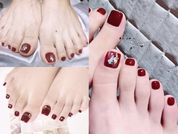 Sơn móng chân màu đỏ rượu giúp trắng da, tăng thêm vẻ quyến rũ, sang trọng (Nguồn: Phượng Ớt – Pinterest, Nguyễn Thị Hường – Pinterest, Trần Hà – Pinterest) Móng chân đỏ rượu với kiểu trang trí đính kim tuyến vô cùng lấp lánh, nổi bật (Nguồn: Nail Tuyết North – Pinterest, Selena – Pinterest)Mẫu móng chân làm trắng da màu hồng pastel