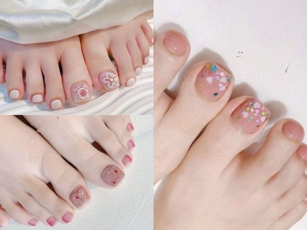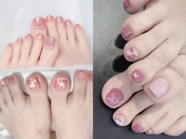Những mẫu nail chân đẹp nhẹ nhàng màu hồng pastel dành cho những cô nàng nữ tính, ngọt ngào (Nguồn: beaudy.vn, ttlnail – Pinterest, Thục Hiền Nail – Pinterest,) Màu sơn móng này phù hợp với những kiểu váy thướt tha hay trang phục trẻ trung, dịu dàng (Nguồn: Thu Hà Nail – Pinterest, Vy Hạ Đỗ – Pinterest)Mẫu móng chân màu hồng đất trắng da