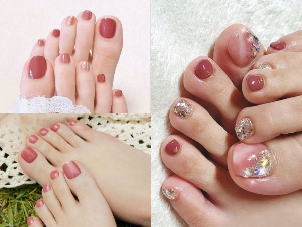 Nail chân màu hồng đất có độ trầm phù hợp cho cả các bạn nữ có làn da ngăm, đen (Nguồn: Olad Beauty – Pinterest, HowLifeStyles – Pinterest, CLAUDIA NAIL – Pinterest) Kiểu nail chân màu hồng đất trang trí đơn giản với kim tuyến, đính đá rất phù hợp với cô nàng công sở (Nguồn: hillyhillyhills – Pinterest, oraha.com, nailbook.jp)Màu sơn móng chân làm trắng da nâu tây