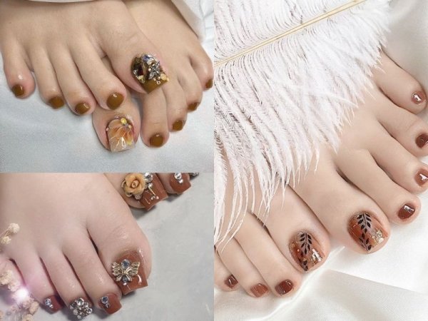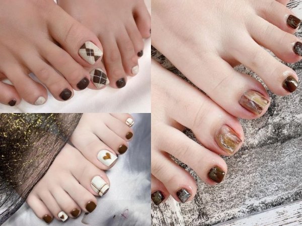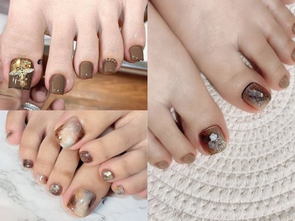 Sơn móng chân màu nâu tây phù hợp với mọi tone da, mang lại phong cách thời thượng (Nguồn: Ann Nhi – Pinterest, nailmetom – Pinterest, PhanNgocBich999 – Pinterst) Móng chân màu nâu tây kết hợp họa tiết hoa lá vừa nổi bật, vừa thanh lịch, quý phái (Nguồn: Đặng Nhung – Pinterest, Dương Bưởi Nail – Pinterest, Đậu Nành – Pinterest)Màu nail đẹp tôn da chân nâu đất