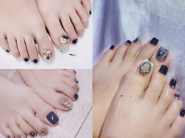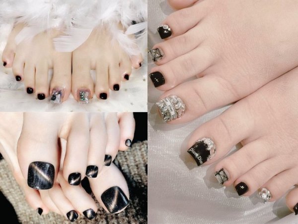 Sơn móng chân màu đen vô cùng huyền bí và sang trọng (Nguồn: Lam Lam – Pinterest, PhanNgocBich999 – Pinterest, phamkim2k32020 – Pinterest) Màu sơn này giúp làm nổi bật các hiệu ứng kim tuyến, đính đá (Nguồn: temu.com, damthikimngoc1990 – Pinterest, Đậu Nành – Pinterest)> Xem thêm: Gợi ý 30+ mẫu nail đơn giản đẹp nhẹ nhàng cho bạn gái