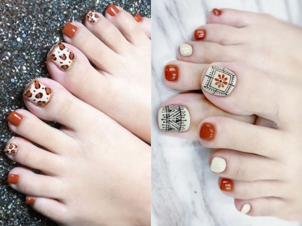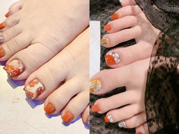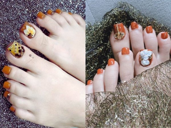 Màu sơn móng chân cam đất giúp nổi bật tone da, đem đến phong cách sành điệu, trẻ trung (Nguồn: Warm Nail Studio – Pinterest, Vika – Pinterest) Nail chân cam đất đính đá vô cùng nổi bật phù hợp phù hợp cho những buổi tiệc (Nguồn: Chinh Chinh Nail – Pinterest, Hương Nail – Pinterest,) Mẫu nail màu cam đất vẽ họa tiết độc đáo phù hợp với những trang phục cá tính, phong cách (Nguồn: Ann Nhi – Pinterest)Mẫu nail móng chân làm trắng da xám