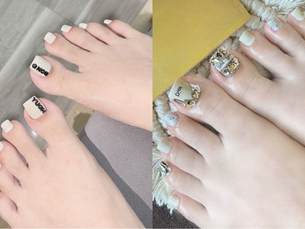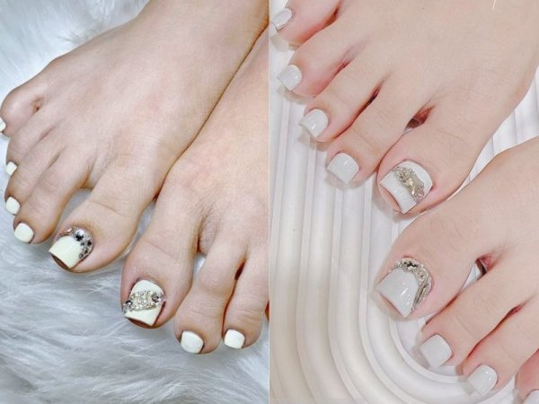 Sơn móng màu trắng ngà có độ bền không cao, dễ bị bám bẩn (Nguồn: Minh Chi – Pinterest, Yellow Nail – Pinterest) Sơn móng chân màu trắng ngà dễ kết hợp với các kiểu đính đá, đính charm (Nguồn: Polish Nail – Pinterest, Cẩm Thu Cao – Pinterest) Nail chân màu trắng ngà phù hợp cho những buổi tiệc nhẹ nhàng, ấm cúng (Nguồn: Phan Hồng Vy – Pinterest, Thutrang – Pinterest)Nail chân sơn kim tuyến giúp tôn da