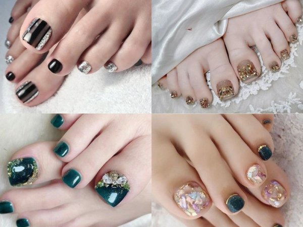 Mẫu móng chân màu đỏ, nude đính kim tuyến rực rỡ, nổi bật và lấp lánh (Nguồn: himson – Pinterest, Jonestrantranxxi – Pinterest, Polish Nail – Pinterest) Nail đính kim tuyến màu đen, xanh sẽ mang lại vẻ đẹp sang trọng rực rỡ, quý phái (Nguồn:fs388168 – Pinterest, Mộng Tuyền – Pinterest, Thu Nga – Pinterest, Kiều Trang – Pinterest)Móng chân sơn tráng gương làm trắng da