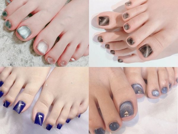 Được lấy cảm hứng từ mắt mèo, mẫu nail này mang đến sự huyền bí và kiểu dáng độc đáo, thu hút ánh nhìn. Mẫu nail này thường được sơn màu đen, bạc, trắng, xanh để dễ tạo hiệu ứng lấp lánh và hạn chế làm tối màu da. Đặc biệt, mẫu nail chân mắt mèo có thể kết hợp với các hoạ tiết khác như làm móng đính đá, đính kim tuyến,… sẽ tăng thêm sự sang trọng và quý phái. Mẫu nail chân mắt mèo không chỉ giúp đôi chân thêm nữ tính, mà còn có thể tạo điểm nhấn cho trang phục của bạn.