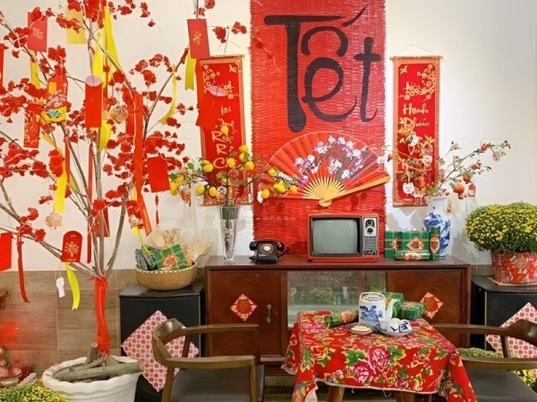 Cách trang trí ngày Tết truyền thống sẽ mang đến cảm giác ấm cúng, hoài cổ cho không gian của bạn. Thông thường, kiểu trang trí này sẽ ưu tiên sử dụng những đồ vật làm từ gỗ, tre mộc mạc, đơn giản. Ngoài ra, sự xuất hiện của cây mai, đào, bánh chưng cùng những câu đối đỏ mang đậm nét đẹp truyền thống văn hóa Việt Nam sẽ tạo nên tổng thể vô cùng ấn tượng. Nếu bạn có không gian riêng đủ lớn, bạn có thể tìm mua những đồ vật cổ những năm 2000 như tivi, bàn ghế, điện thoại,… và trang trí tiểu cảnh Tết cổ truyền nhé.