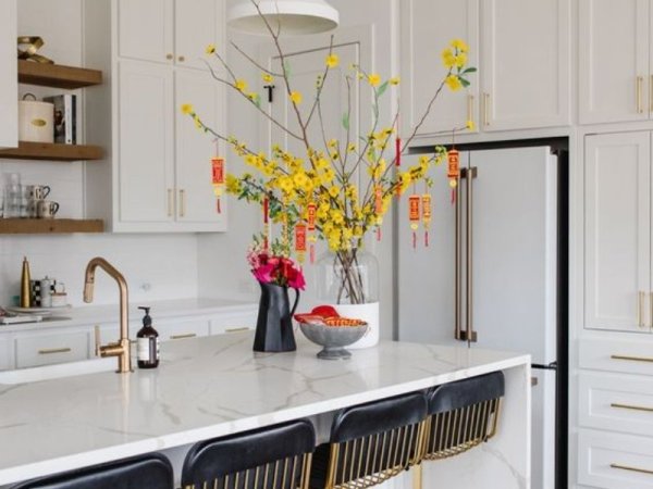 Khu vực bàn ăn có thể vẽ trang trí Tết đơn giản và kết hợp một vài phụ kiện lên tường (Nguồn: floral272002 – Pinterest) Trang trí khu vực bếp đơn giản, gọn gàng với cây mai Tết (Nguồn: HKCung – Pinterest) MUA NGAYCách trang trí bàn thờ ngày Tết