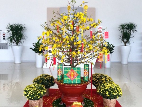 Sắc vàng rực rỡ của hoa mai sẽ rất phù hợp khi kết hợp với các câu đối và phụ kiện trang trí Tết màu đỏ để tạo nên sự nổi bật và tương sắc. Để thêm phần mới mẻ, bạn có thể tham khảo các kiểu mai kiểng hoặc kết hợp trang trí mai với các loại cây hoa khác nhé.