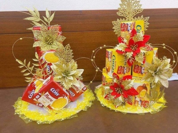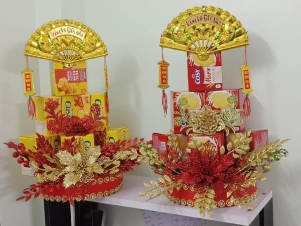 Tráp bánh được xếp chồng lên nhau thành hình tháp với nhiều hình dáng kết hợp phụ kiện sẽ là một cách trang trí Tết vô cùng độc đáo và thiết thực cho bàn thờ gia tiên hoặc ở phòng khách. Bạn nên chọn những hộp bánh có màu đỏ, vàng để đồng nhất với hình ảnh Tết. Tháp bánh cao khoảng 3 tầng thêm phụ kiện cành hoa, dây treo tết hay ruy băng sẽ cực kỳ bắt mắt. Bạn cũng có thể dùng những tráp bánh này cho những mâm cúng Tết nhé.