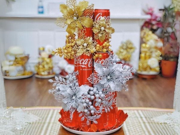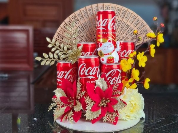 Cũng giống như tráp bánh Tết, mâm nước ngọt cũng là một cách trang trí khá bắt mắt cho dịp đón xuân. Những lon nước ngọt có màu sắc sặc sỡ kết hợp kiểu trang trí cầu kỳ, lung linh sẽ giúp không gian sống của bạn thêm lộng lẫy sắc xuân. Ngoài ra, đây cũng là một món quà khá thú vị khi tặng cho những người thân yêu của mình.